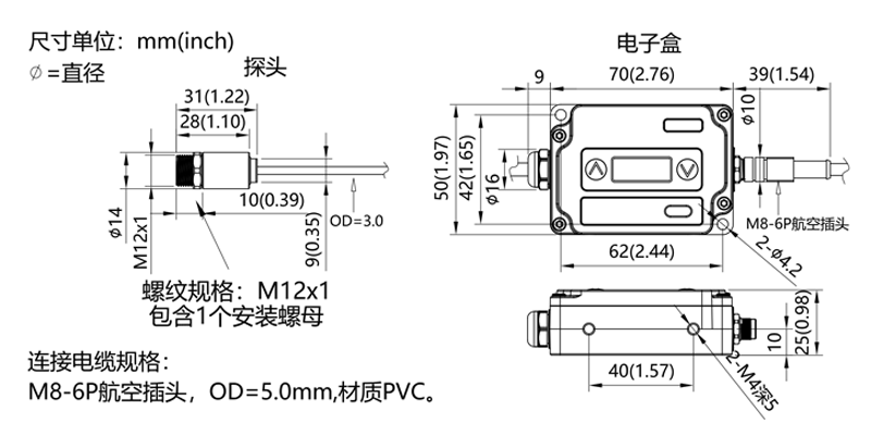 探头到电子盒 1m(标准),3m、8m、15m(可选) |